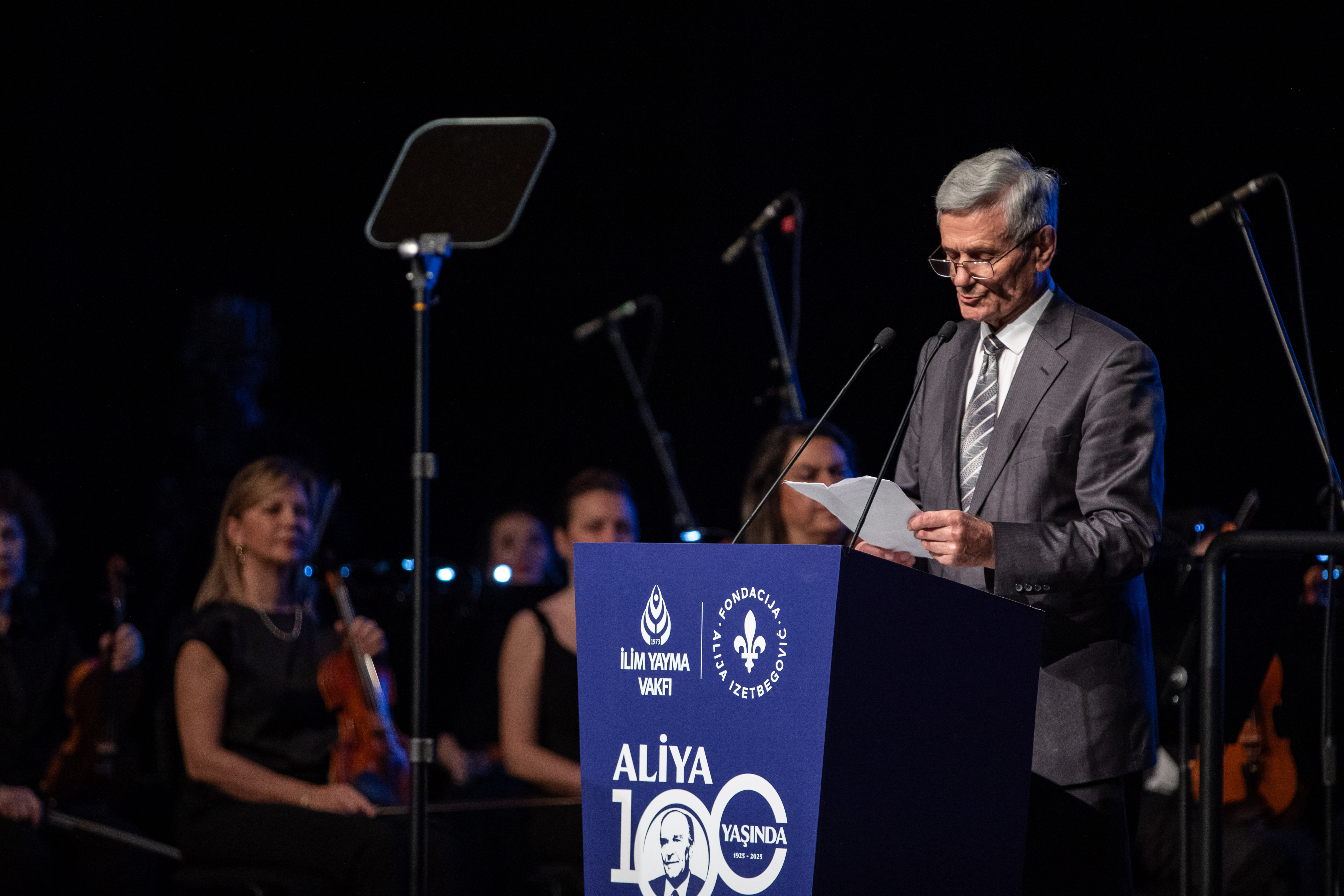 Senfoni öncesi konuşan Necmeddin Bilal Erdoğan, bu buluşmanın yalnızca bir anma programı olmadığını vurgulayarak, “Bu akşam, doğumunun 100. yılında Aliya İzetbegoviç’in hayatını, fikir dünyasını ve insanlık onuruna dayalı mücadelesini anmak üzere bir araya gelmiş bulunuyoruz. Bu buluşma, yalnızca bir anma vesilesi değil; aynı zamanda hafızayla, sorumlulukla ve gelecekle kurulan bir düşünce buluşmasıdır,” ifadelerini kullandı.